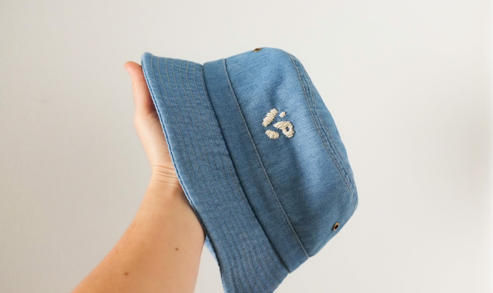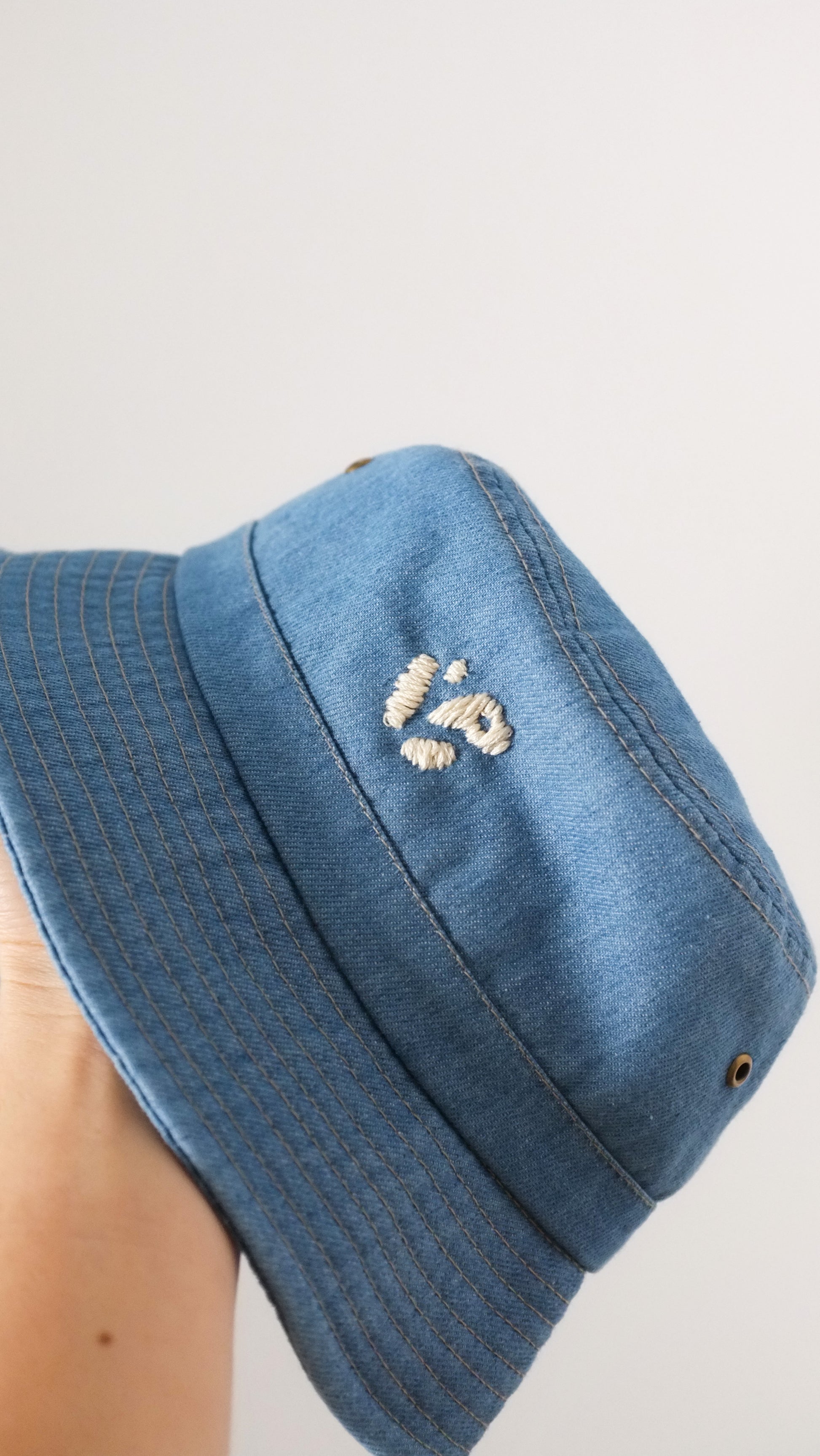 Bob en jean clair, avec le « P » de Pépins brodé à la main.