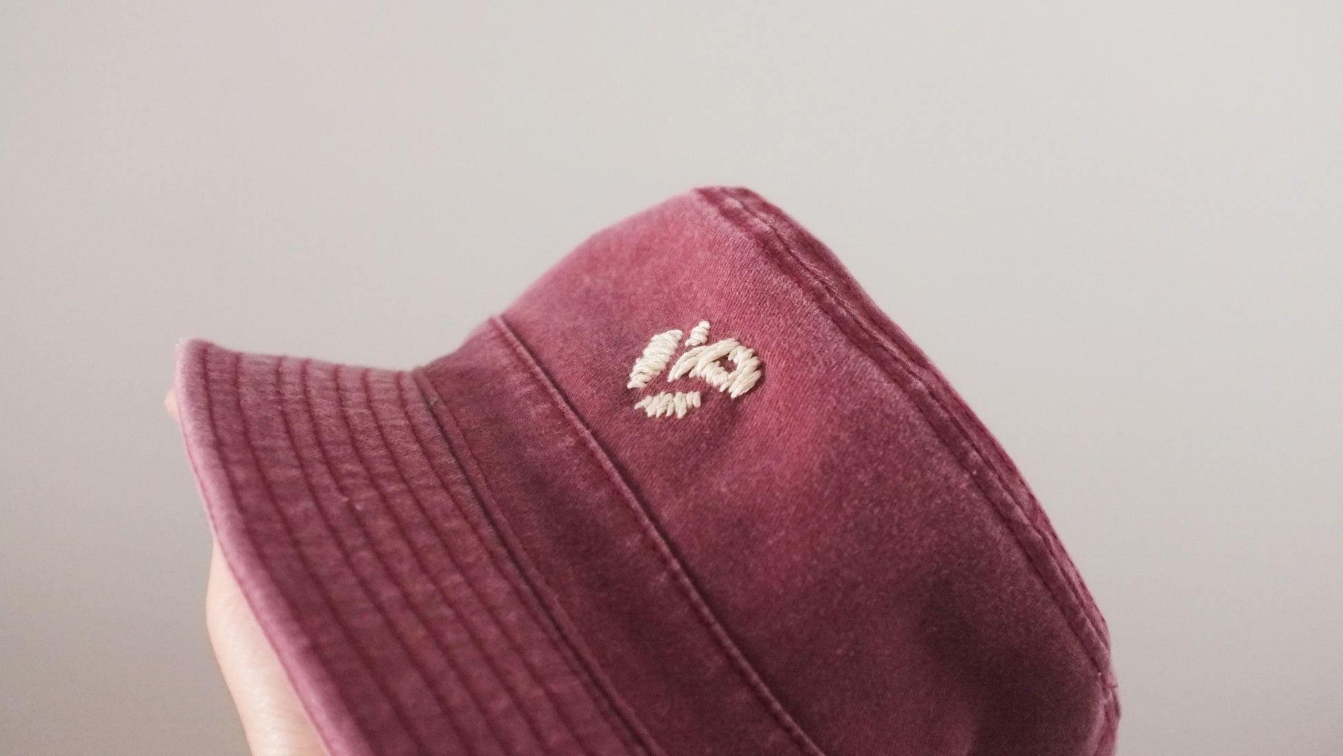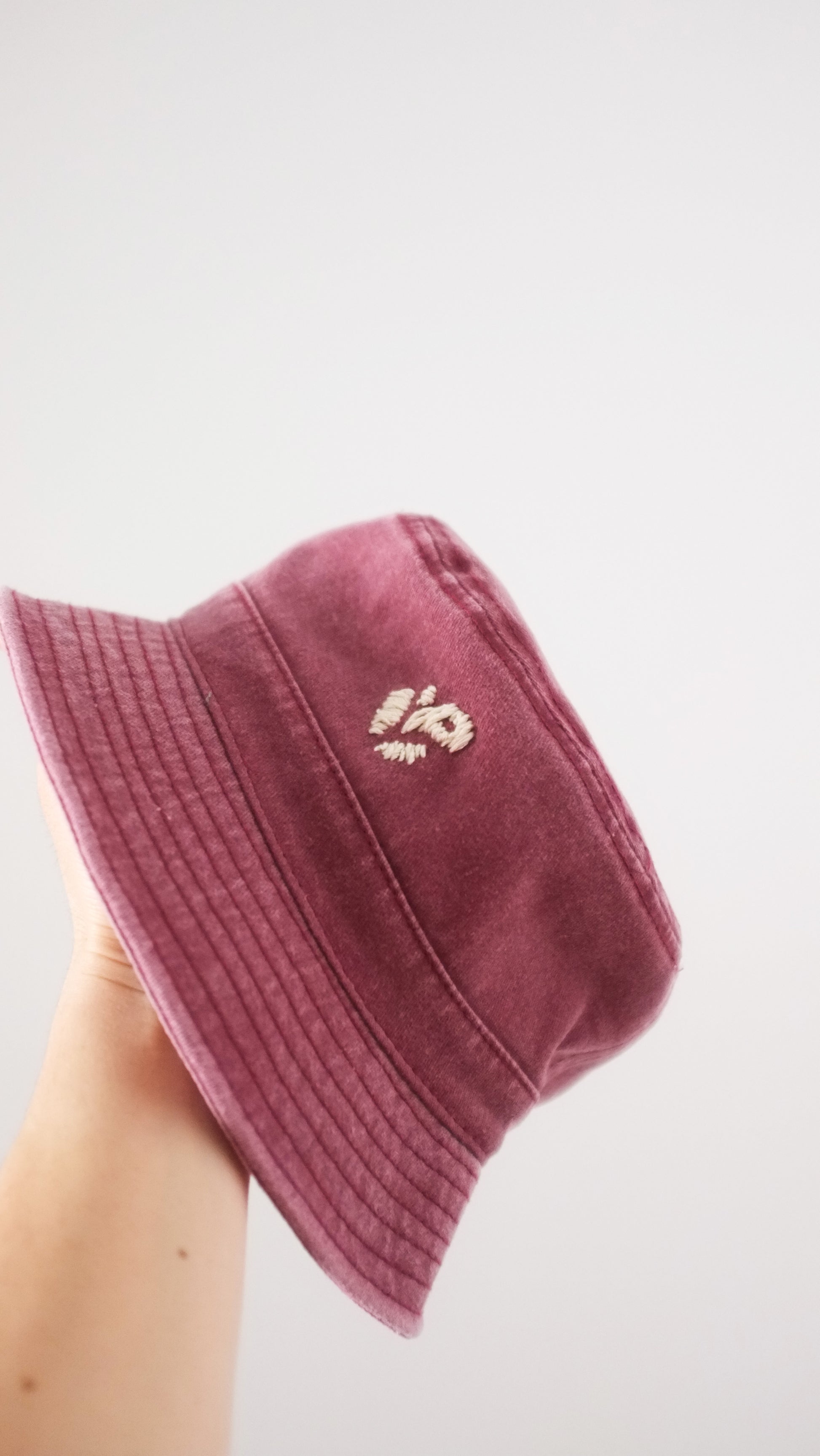 Bob rouge bordeaux, avec le « P » de Pépins brodé à la main.