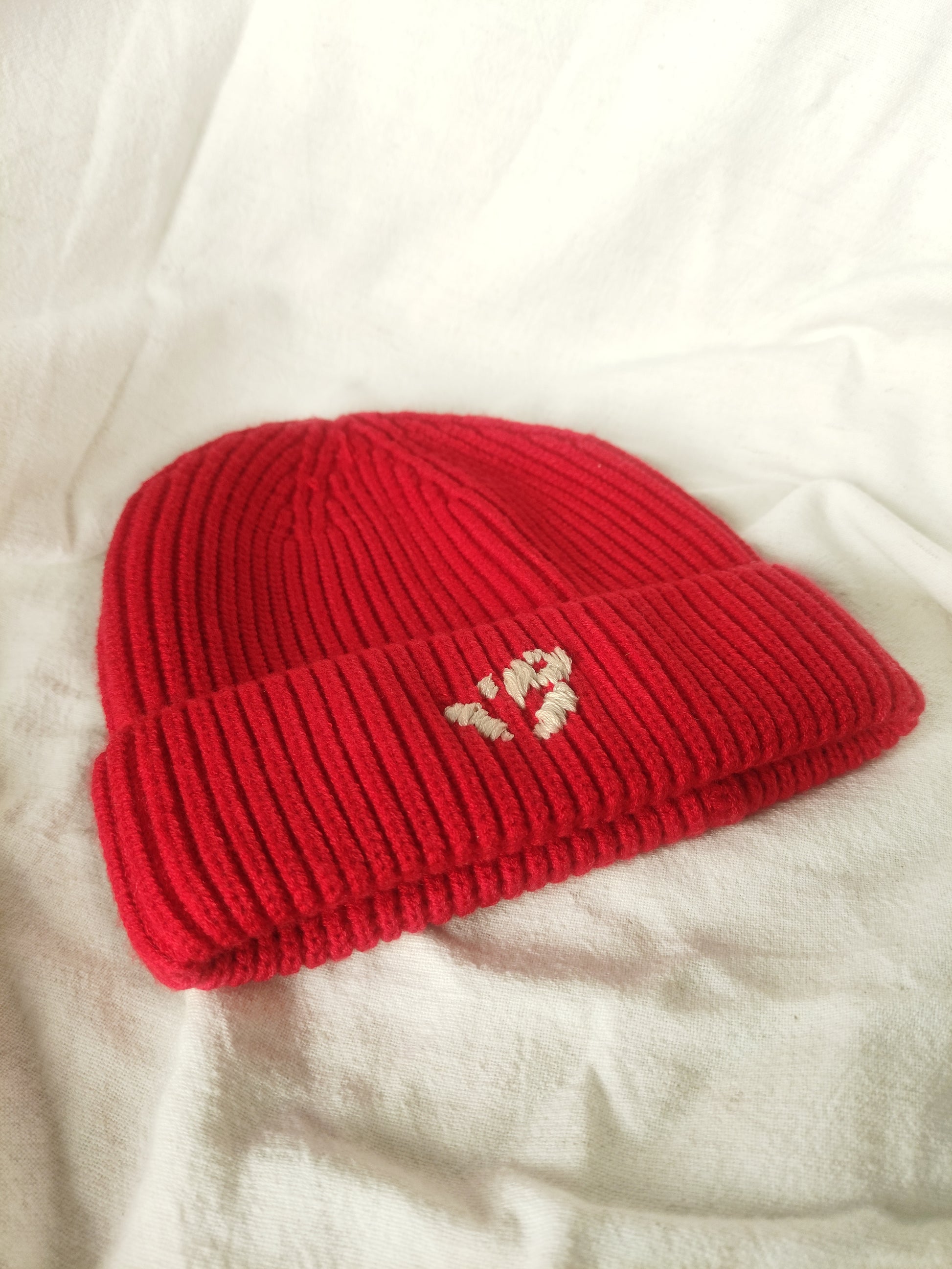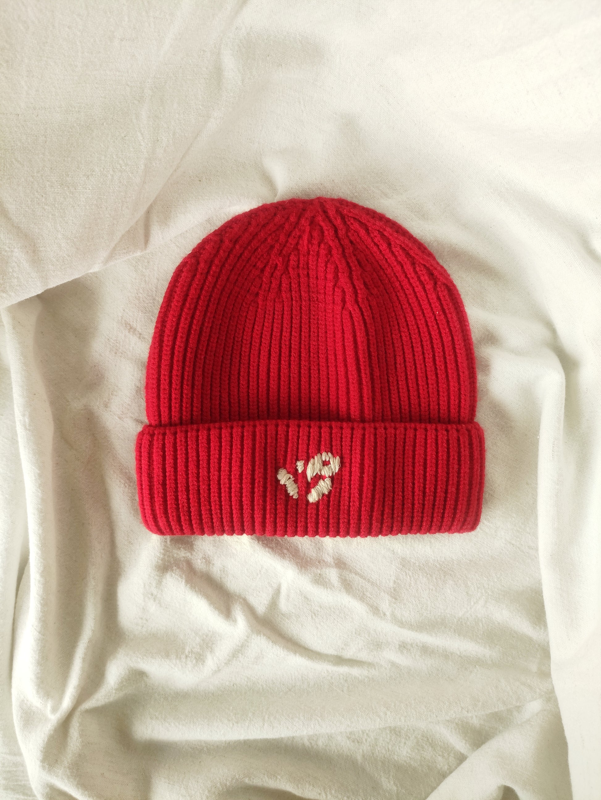 Bonnet rouge, avec le « P » de Pépins brodé à la main.