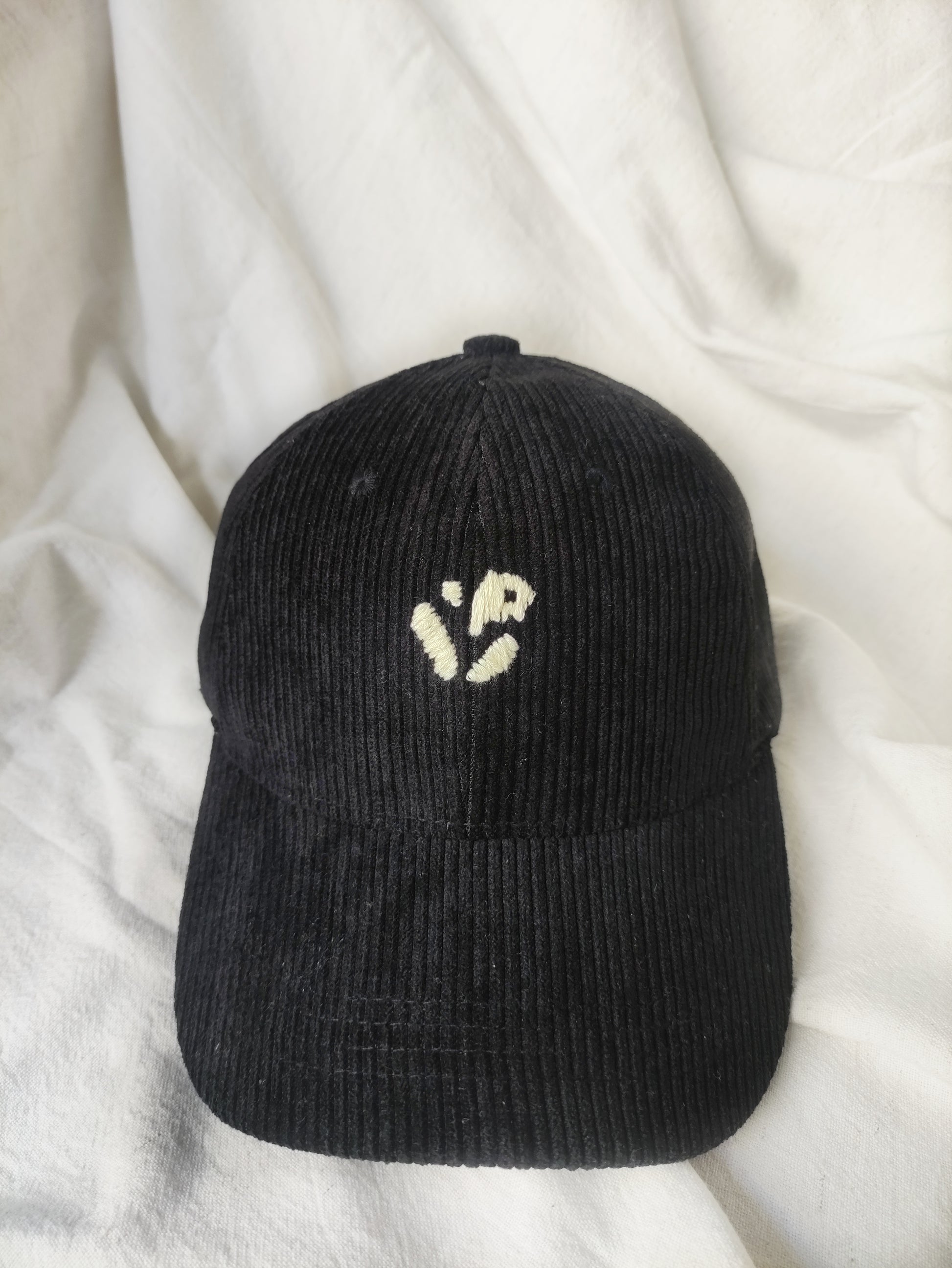 Casquette en velours côtelé noir, avec le « P » de Pépins brodé à la main, en beige.