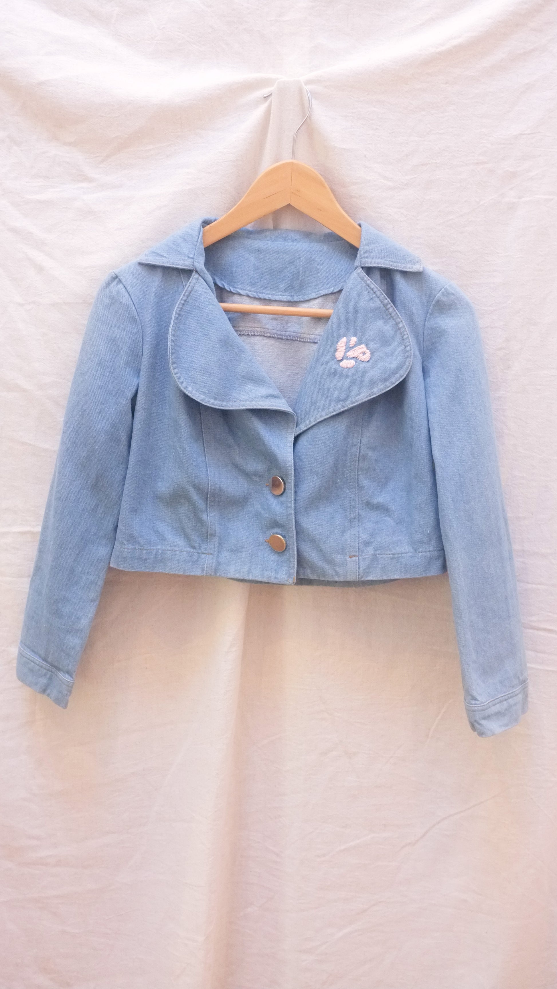 Jolie veste courte en jean, avec un « P » rose clair brodé sur son col large.